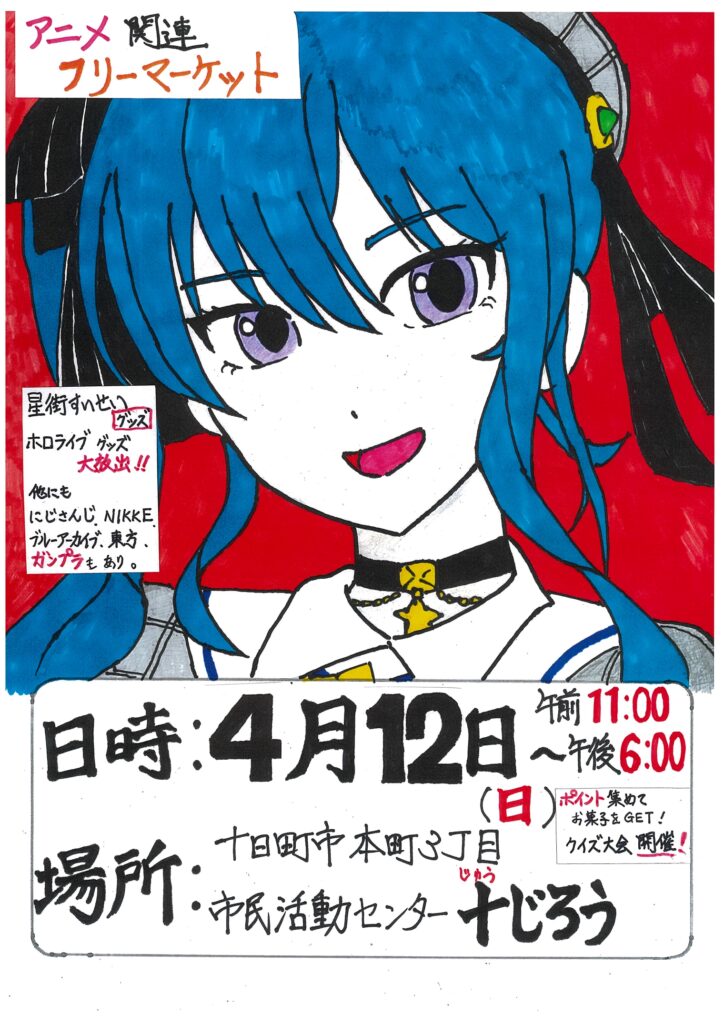 日にち:4月12日(日) 時 間:11時~18時まで 会 場:十じろうギャラリー 4月のアニフリは 星街すいせいグッズや ホロライブグッズを大放出! 他にも にじさんじ・NIKKE ブルーアーカイブ・東方などなど。 ガン…