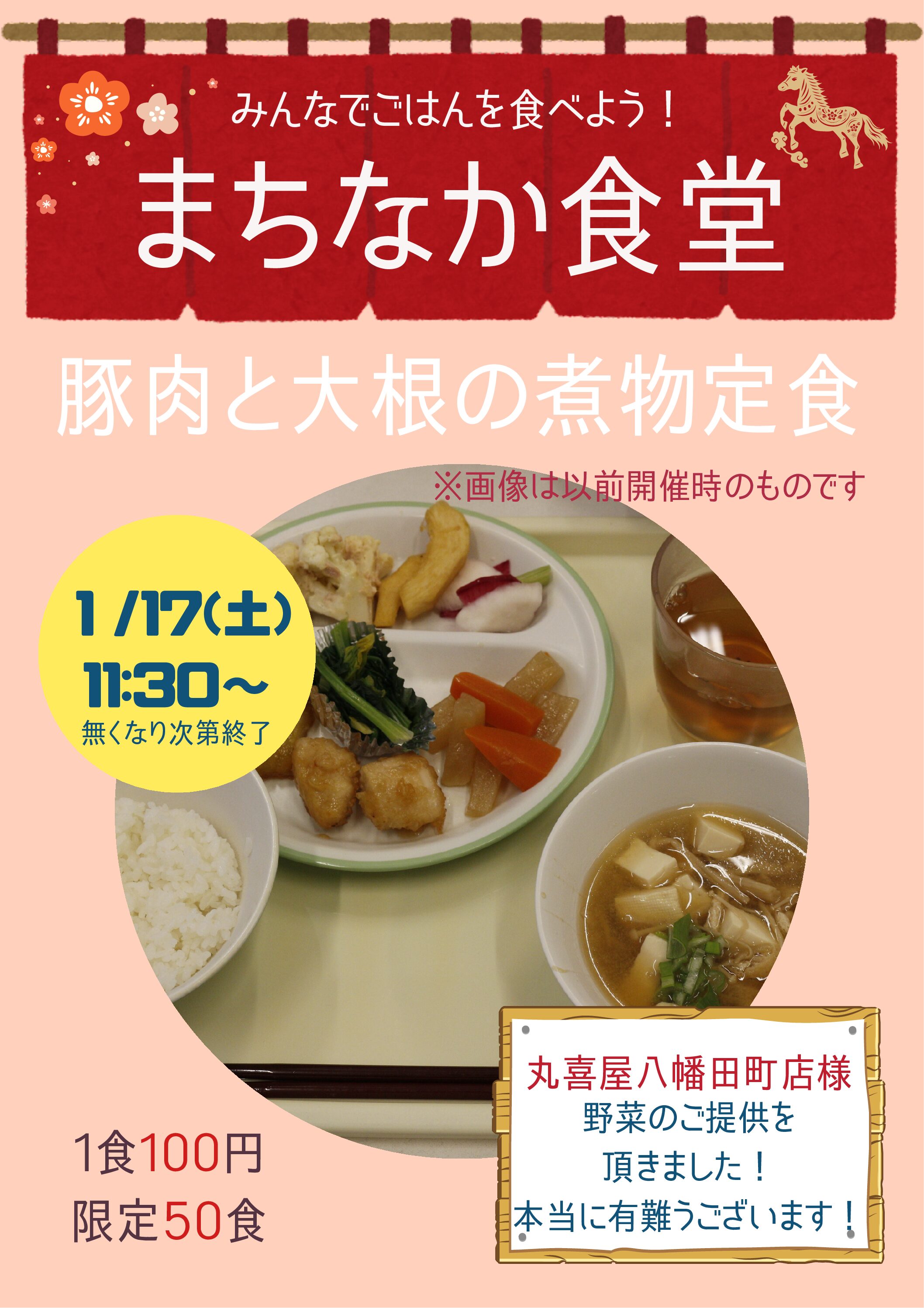子どもたちや高齢者など、多くの人が食事を共にすることで交流を図ってもらうことを目的に 毎月第3土曜日に「娯楽の日」と同時開催している「まちなか食堂」。 【期 日】1月17日(土) 【時 間】11:30開始 無くなり次第終…