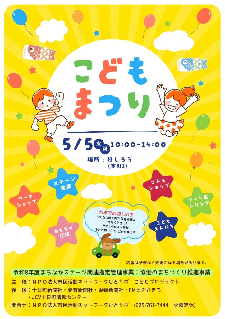 4月のASOBOはお休みとなります。 『こどもまつり2026』 【日 時】5/5(火・祝) 【時 間】10:00~14:00 【会 場】分じろう(本町2) 【内 容】ステージ発表・こどもショップ・各種ワークショップ・ドリ…
