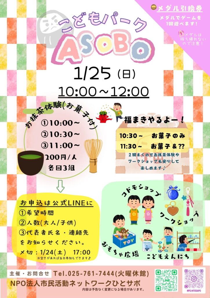 『こどもパークASOBO』 【日 時】1/25(日) 【時 間】10:00~12:00 【会 場】分じろう(本町2) 【内 容】福まき・お抹茶体験会・コドモショップ・各種ワークショップ・こどもえんにち・おもちゃ広場など …